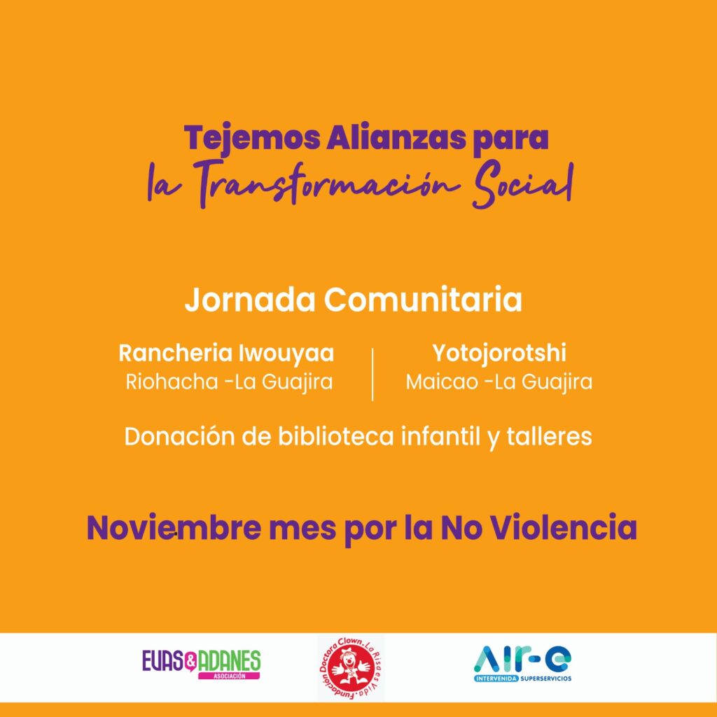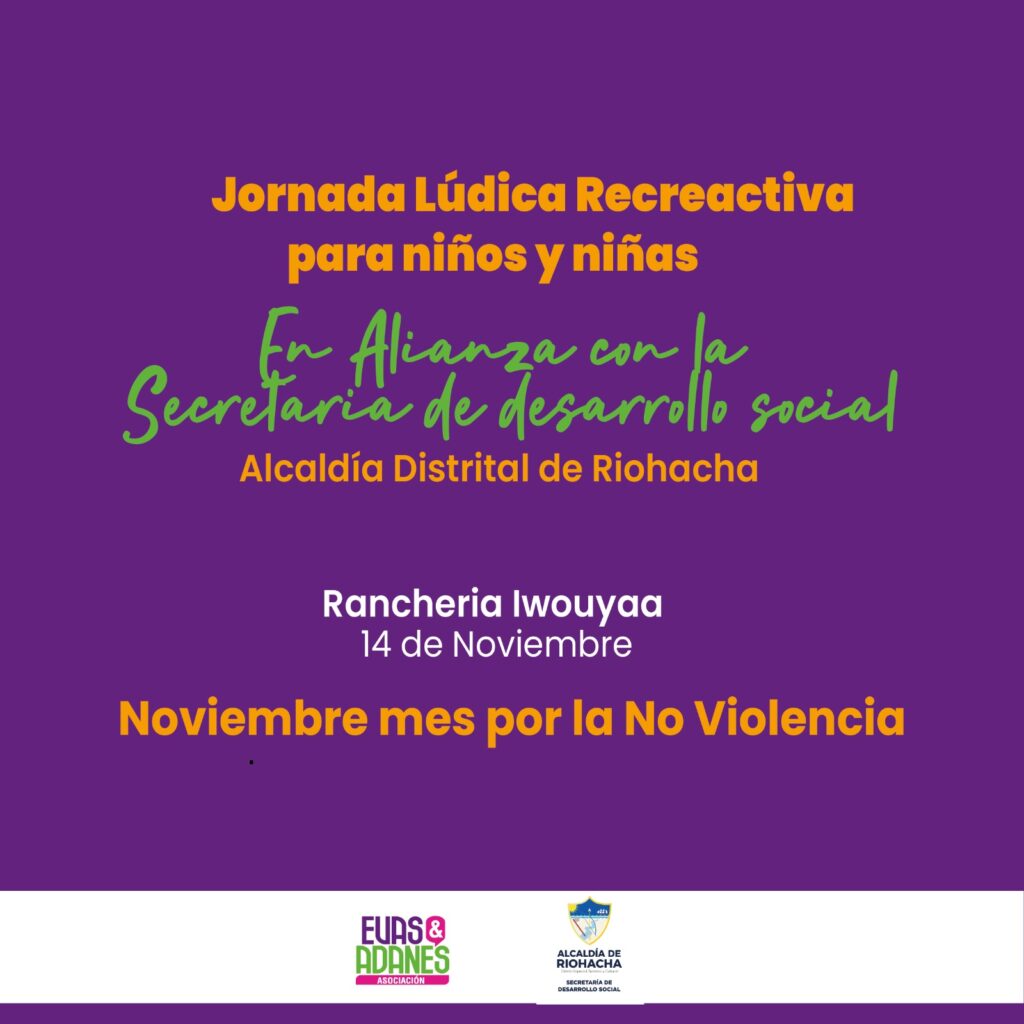 La asociación Evas&Adanes trabaja todo el año por los derechos humanos femeninos, la equidad, igualdad y la no violencia, sin embargo, en noviembre, mes en el cual, se conmemora en todo el mundo la no violencia contra las mujeres y los 16 días de activismo que van hasta el 10 de diciembre, han co-creado una agenda local para La Guajira y otros departamentos del caribe colombiano, con enfoque interseccional, exaltando los liderazgos de mujeres indígenas y afros y la riqueza de nuestra región, que es cabeza de colombia y tiene el privilegio de ser el único departamento que se escribe con pronombre femenino entre 32 del país.